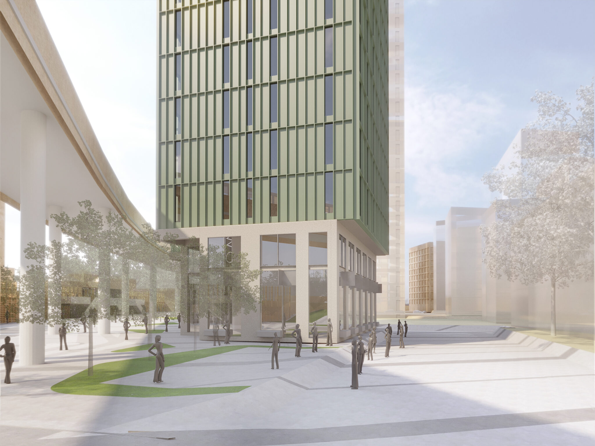 The boulevard provides the main east west connection from the DLR to the Aparthotel and beyond. At the centre, the Plaza provides for functions linked to the Aparthotel – such as cafe spill out, pop ups and outdoor events. The Playground utilises the existing topography which includes a steep bank, rising to a flat plateau and provides informal sports pitches including a half basketball court, table tennis tables and a badminton court. A strong planted structure envelops the playground, providing relief to the noisy and polluted corridor.