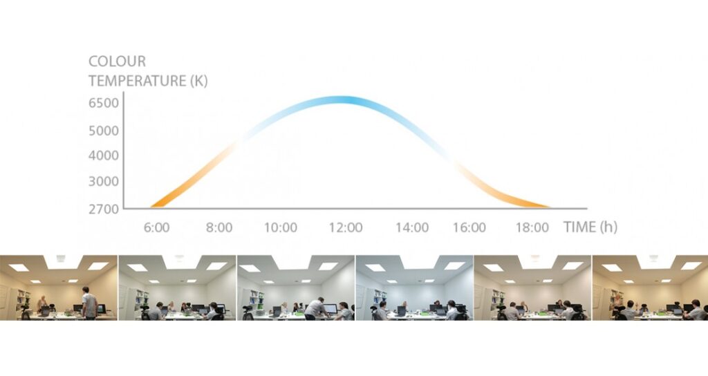 The most beneficial operation of an HCL installation is a cool white light in the mornings and warm white light in the evenings. With a DALI lighting control system, the HCL installation could be configured for various starting times/shifts and offers more flexibility to the installation. The difference between cool white and warm white light can be seen in the graphic below.