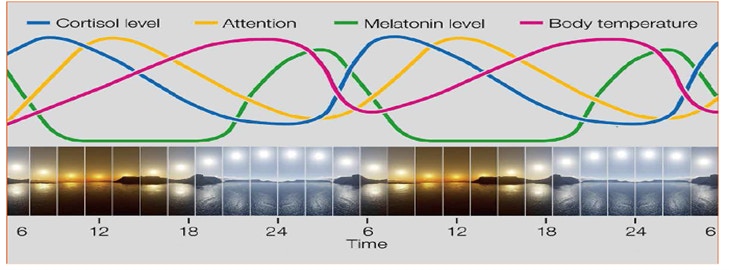 As can be seen from the graphic above, Attention spans peak when cortisol is at its highest level and attention spans are at their lowest when melatonin levels are at their peak. Cortisol production is linked to “cool white” light and melatonin production is linked to “warm white” light.