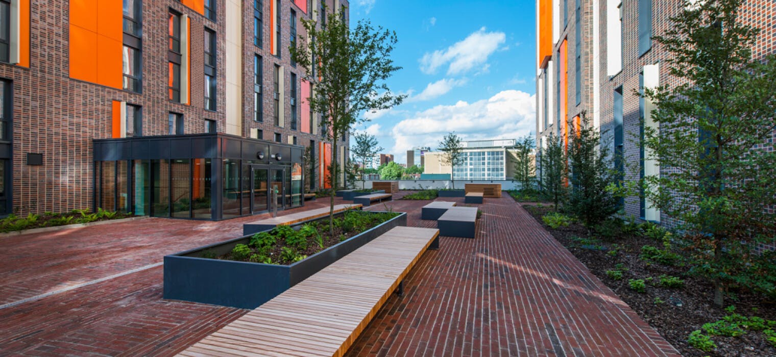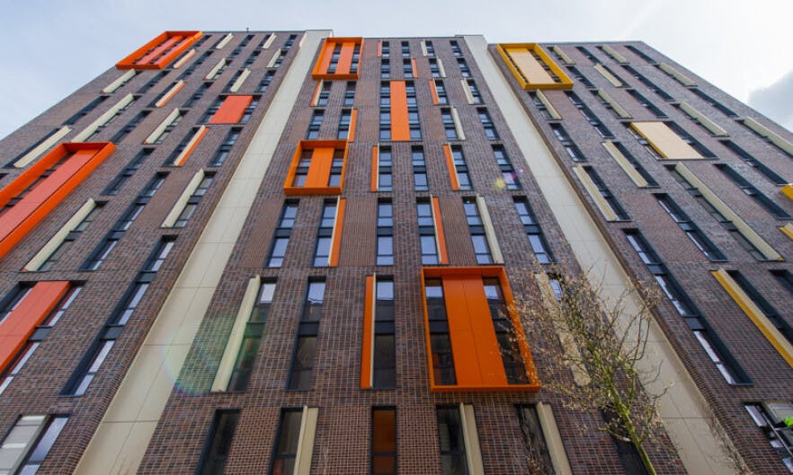 The exterior of the building combines prefabricated brick slip panels, aluminium rainscreen panels, render, and Glass Reinforced Concrete, contributing to a varied and durable façade. The entire project, including the modular steel-framed construction of the student rooms, was completed in just 14 months using the innovative Vision Modular Structures system.