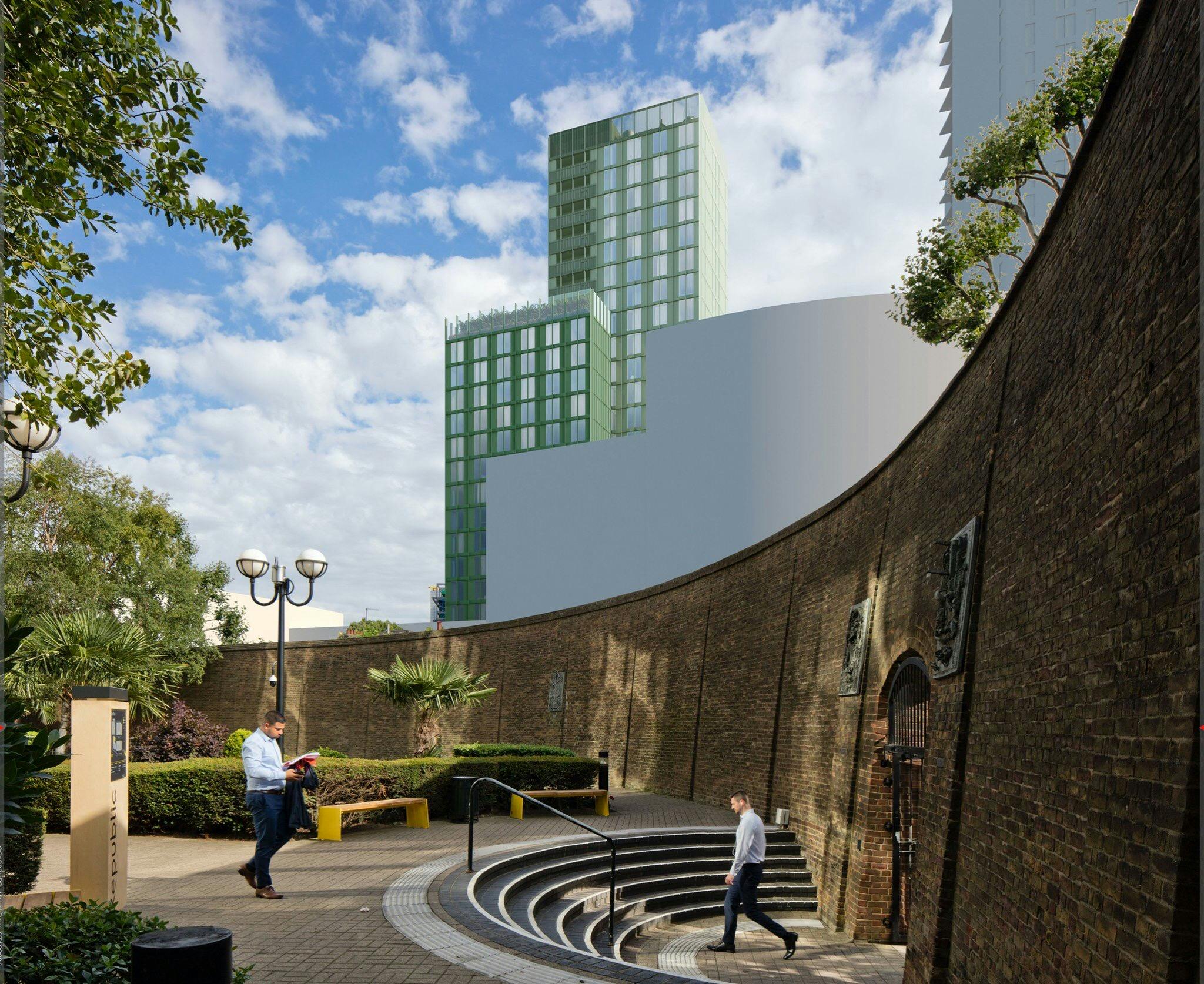 The boulevard provides the main east west connection from the DLR to the Aparthotel and beyond. At the centre, the Plaza provides for functions linked to the Aparthotel – such as cafe spill out, pop ups and outdoor events. The Playground utilises the existing topography which includes a steep bank, rising to a flat plateau and provides informal sports pitches including a half basketball court, table tennis tables and a badminton court. A strong planted structure envelops the playground, providing relief to the noisy and polluted corridor.